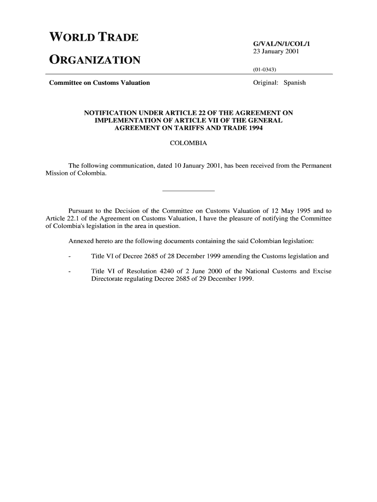 WORLD TRADE/VAL/N/1/COL/1 23 January 2001ORGANIZATION(010343)Original: SpanishCommittee on Customs ValuationNOTIFICATION UNDER ARTICLE 22 OF THE AGREEMENT ON IMPLEMENTATION OF ARTICLE VII OF THE GENERAL