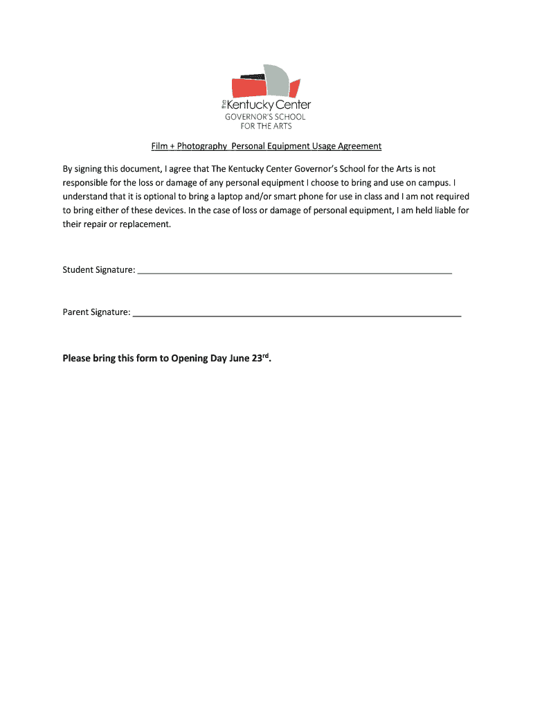 By signing this document, I agree that The Kentucky Center Governors School for the Arts is not
