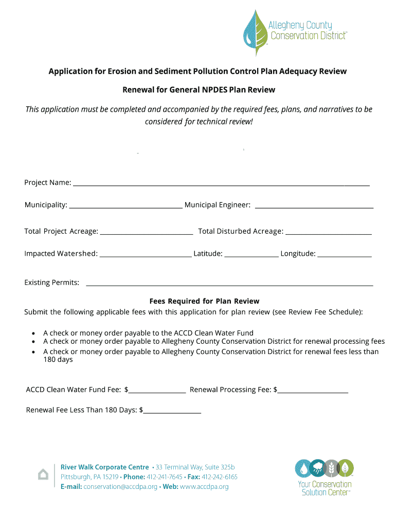 Application for Erosion and Sediment Pollution Control Plan Adequacy Review Renewal for General NODES Plan Review This application must be completed and accompanied by the required fees, plans, and
