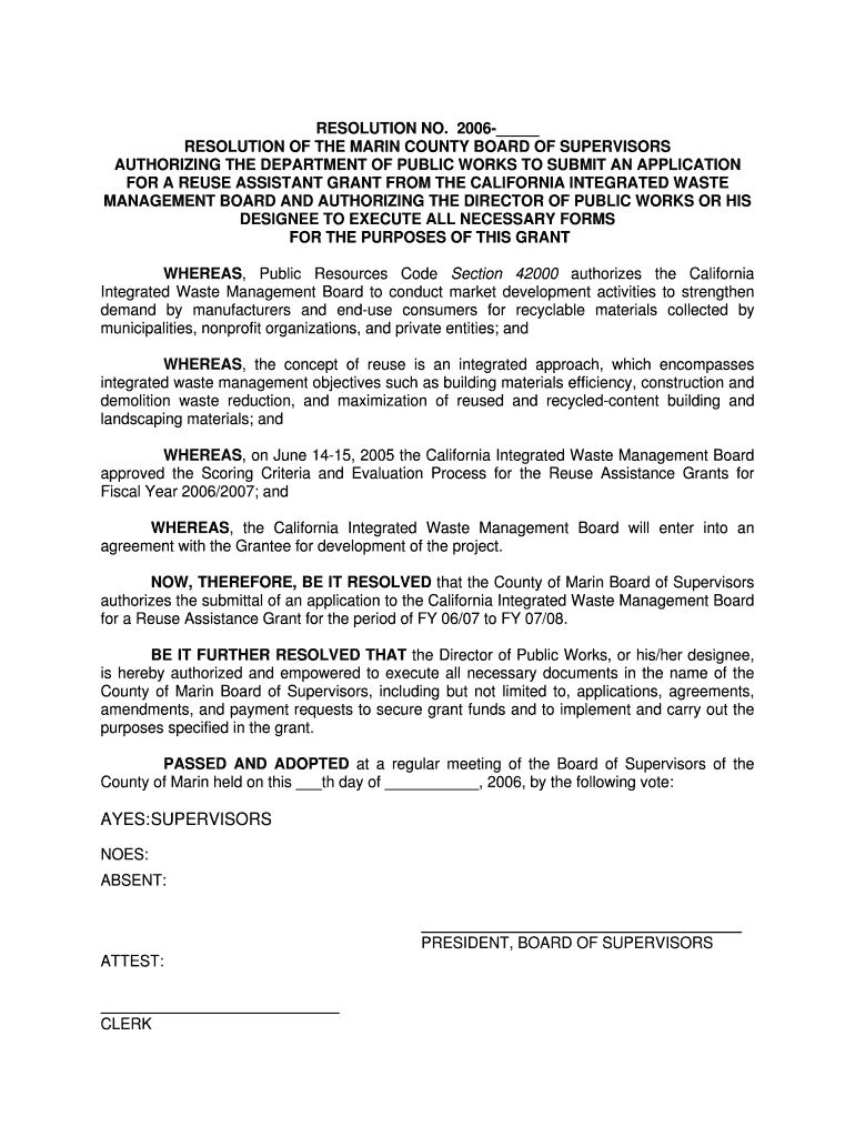 RESOLUTION NO. 2006 RESOLUTION OF THE MARIN COUNTY BOARD OF SUPERVISORS AUTHORIZING THE DEPARTMENT OF PUBLIC WORKS TO SUBMIT AN APPLICATION FOR A REUSE ASSISTANT GRANT FROM THE CALIFORNIA INTEGRATED
