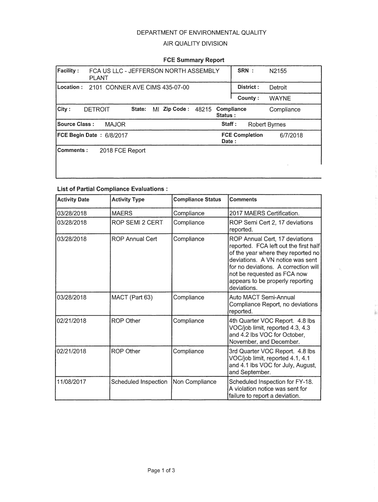 DEPARTMENT OF ENVIRONMENTAL QUALITY AIR QUALITY DIVISION FCE Summary Report Facility :FCA US LLC JEFFERSON NORTH ASSEMBLY PLANTS RN:N2155Location:2101 CONNER AVE AIMS 4350700District:DetroitCounty:WAYNECity:Ml