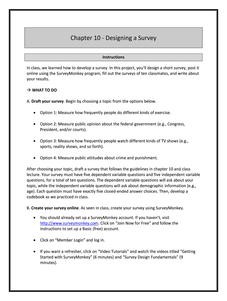 Chapter10DesigningaSurvey Instructions In class, welearnedhowtodevelopasurvey. Inthisproject, youlldesignashortsurvey, posit onlineusingtheSurveyMonkeyprogram, filloutthesurveysoftenclassmates, andwriteabout