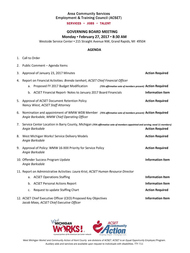 Area Community Services Employment & Training Council (ASSET) SERVICES JOBS TALENTGOVERNING BOARD MEETING Monday, February 27, 2017 8:30 Westside Service Center 215 Straight Avenue NW, Grand Rapids,