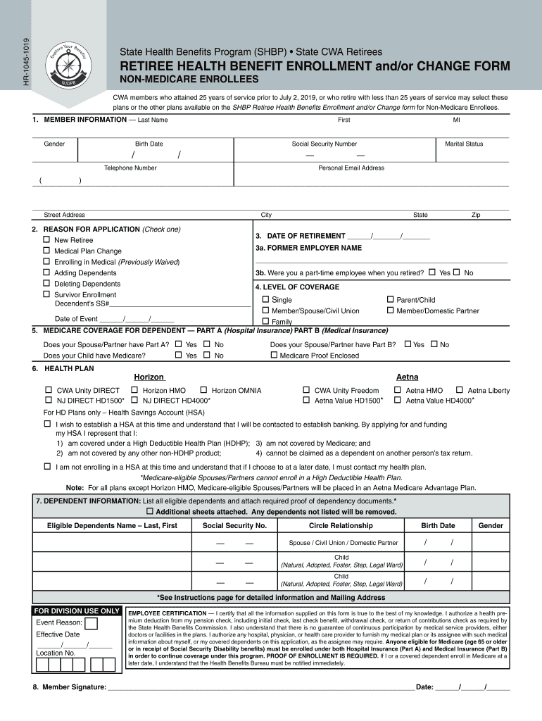 HR10451019State Health Benefits Program (SHIP) State CWA RetireesRETIREE HEALTH BENEFIT ENROLLMENT and/or CHANGE FORM NONMEDICAL ENROLLEESCWA members who attained 25 years of service prior to July