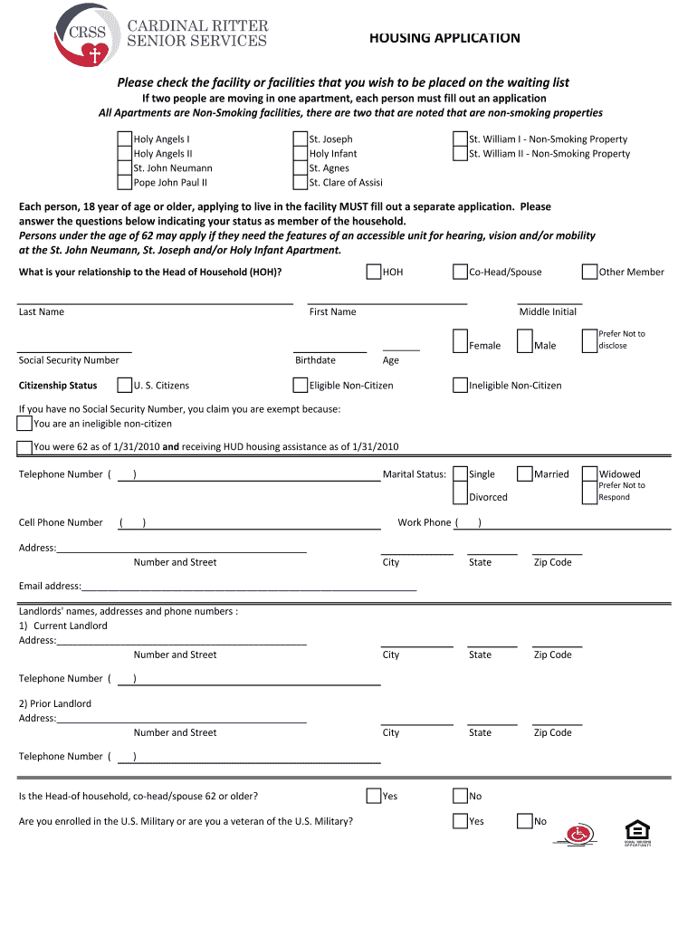 HOUSING APPLICATION Please check the facility or facilities that you wish to be placed on the waiting list If two people are moving in one apartment, each person must fill out an application All Apartments