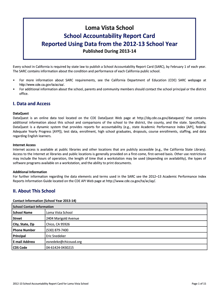 Coma Vista School Accountability Report Card Reported Using Data from the 201213 School Year Published During 201314 Every school in California is required by state law to publish a School Accountability