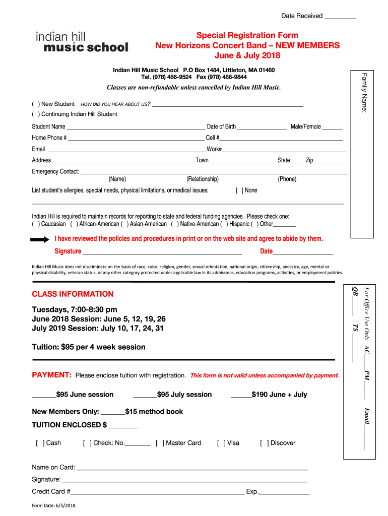 Date Received Special Registration Form New Horizons Concert Band NEW MEMBERS June & July 2018 Family Name:Indian Hill Music School P. O Box 1484, Littleton, MA 01460 Tel. (978) 4869524 Fax (978)