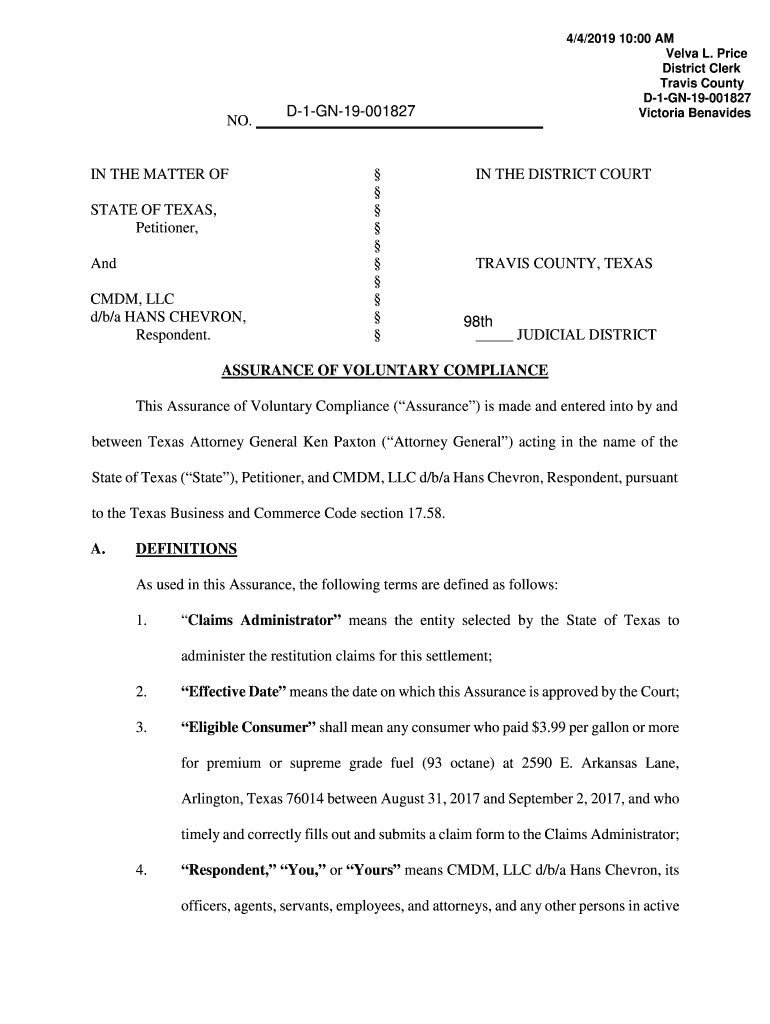 D1GN19001827 NO. IN THE MATTER OF STATE OF TEXAS, Petitioner, And MDM, LLC d/b/a HANS CHEVRON, Respondent. 4/4/2019 10:00 AM Vela L. Price District Clerk Travis County D1GN19001827 Victoria BenavidesIN