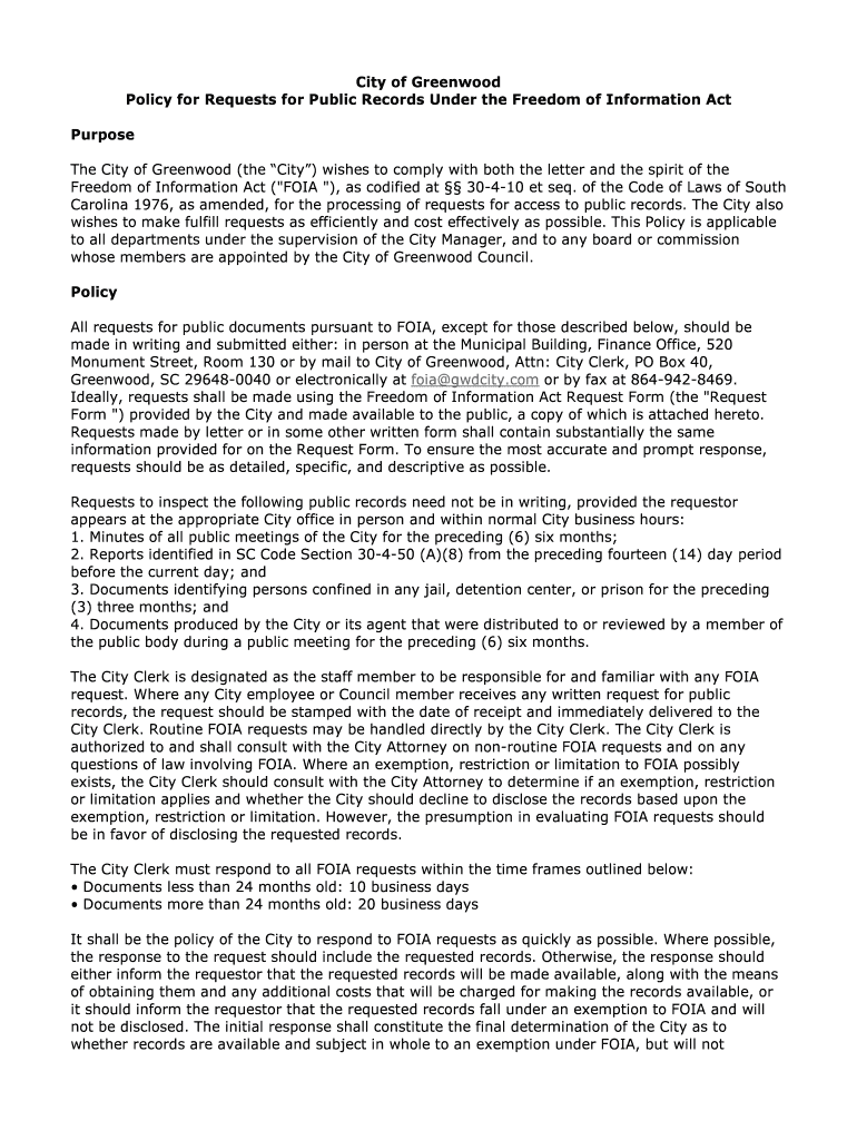 City of Greenwood Policy for Requests for Public Records Under the Freedom of Information Act Purpose The City of Greenwood (the City) wishes to comply with both the letter and the spirit of the Freedom