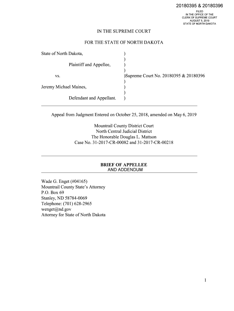 20180395 & 20180396 FILED IN THE OFFICE OF THE CLERK OF SUPREME COURT AUGUST 5, 2019, STATE OF NORTH DAKOTAN THE SUPREME COURT FOR THE STATE OF NORTH DAKOTA State of North Dakota, ) ) Plaintiff and