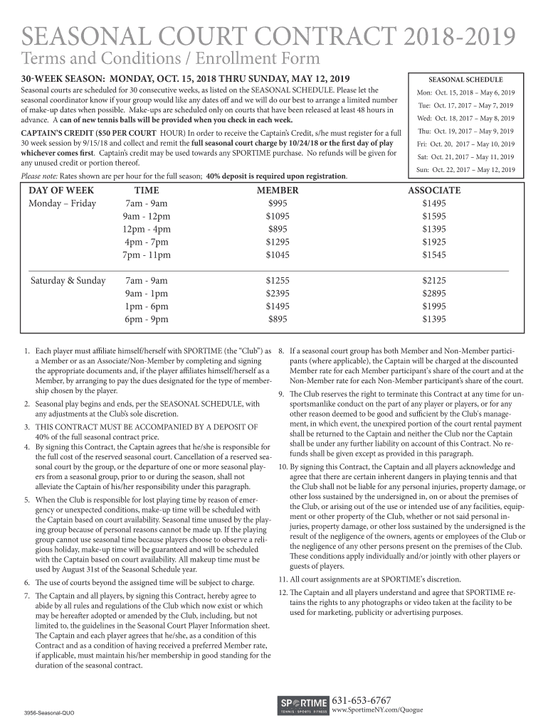 SEASONAL COURT CONTRACT 20182019Terms and Conditions / Enrollment Form30WEEK SEASON: MONDAY, OCT. 15, 2018 Through SUNDAY, MAY 12, 2019,