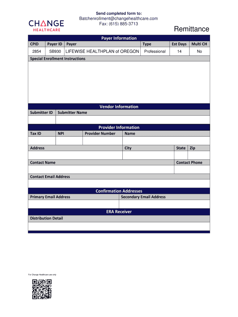 Send completed form to:Batch enrollment changehealthcare.com Fax: (615) 8853713RemittancePayerInformation CPI 2854PayerID Payer Type SB930 LIKEWISE HEALTHILY of OREGON ProfessionalEstDays Multics