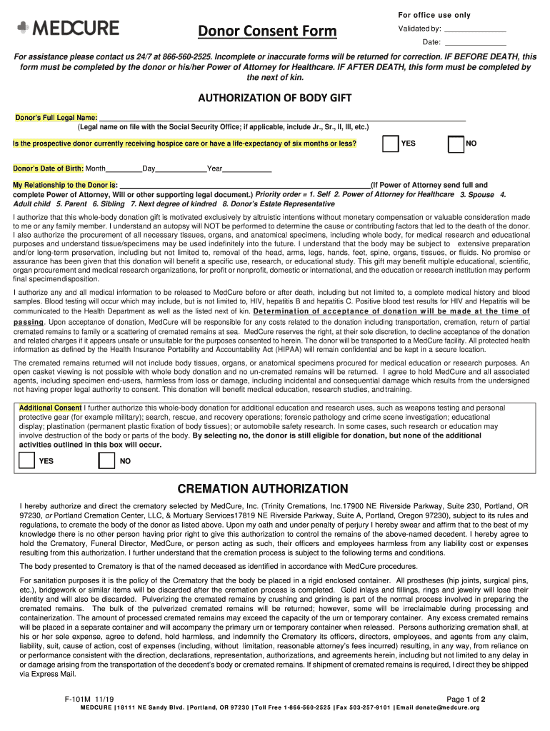 For office use onlyDonorConsentFormValidated by:Date:For assistance please contact us 24/7 at 8665602525. Incomplete or inaccurate forms will be returned for correction. IF BEFORE DEATH, this