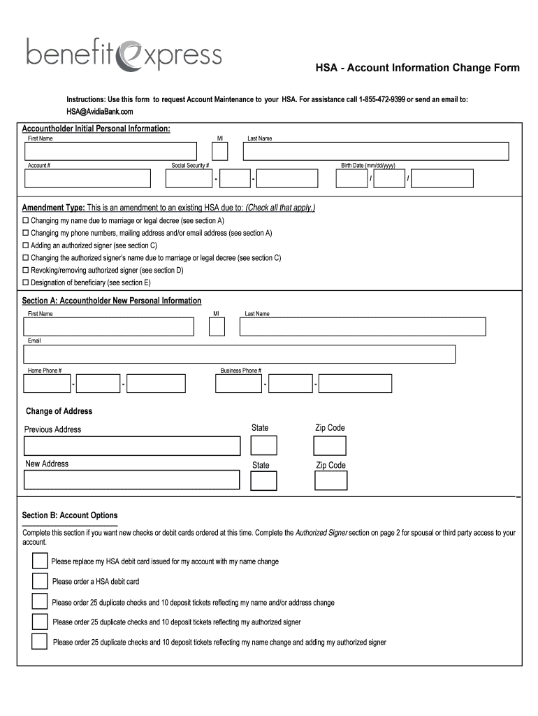 HSA Account Information Change Form Instructions: Use this form to request Account Maintenance to your HSA. For assistance call 18554729399 or email: HSA AvidiaBank.comAccountholder Initial Personal