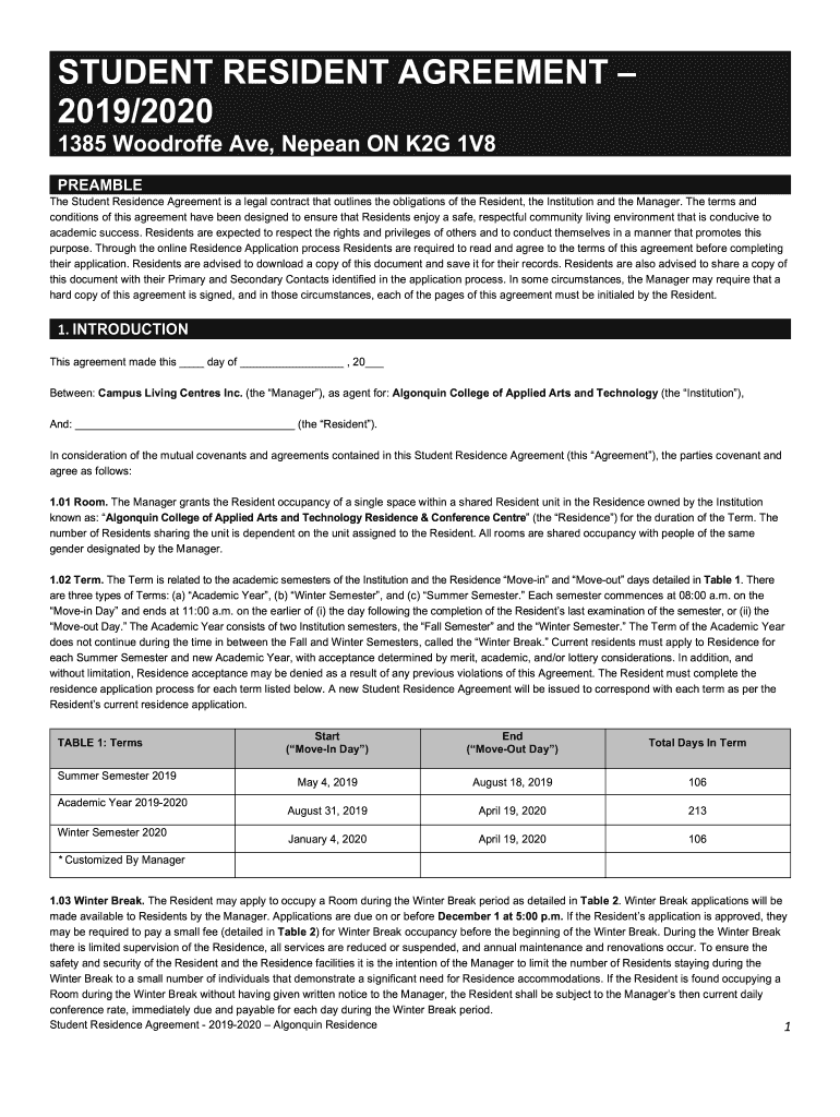 STUDENT RESIDENT AGREEMENT 2019/2020 1385 Woodruff Ave, Repeat ON K2G 1V8 PREAMBLE The Student Residence Agreement is a legal contract that outlines the obligations of the Resident, the Institution