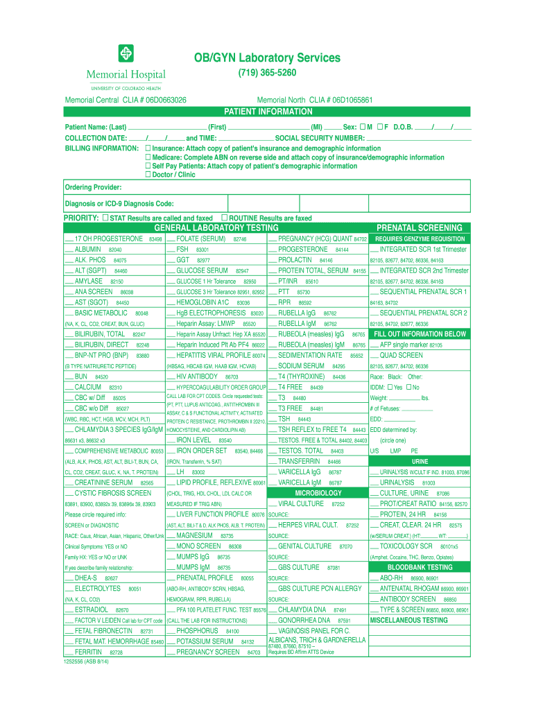 OB/GUN Laboratory Services (719) 3655260Memorial Central CIA # 06D0663026Memorial North CIA # 06D1065861PATIENT INFORMATIONPatient Name: (Last) (First) (MI) Sex: M F D.O.B. / / COLLECTION DATE: /