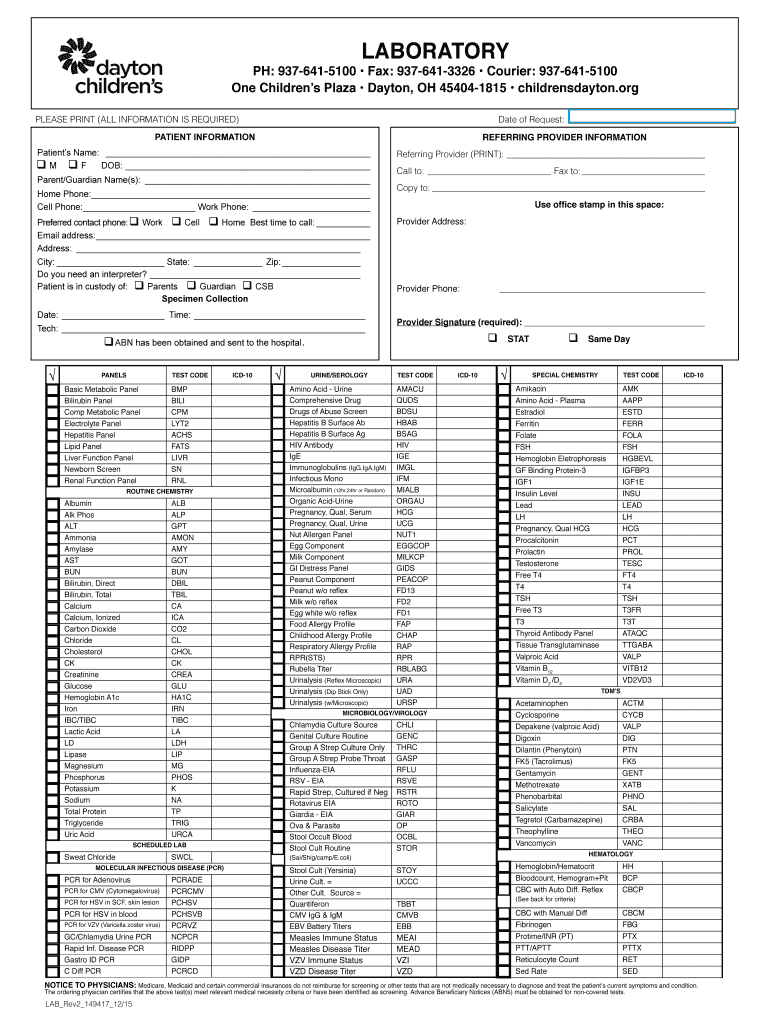 LABORATORY PH: 9376415100 Fax: 9376413326 Courier: 9376415100 One Children's Plaza Dayton, OH 454041815 childrensdayton.org Date of Request: PLEASE PRINT (ALL INFORMATION IS REQUIRED)REFERRING PROVIDER