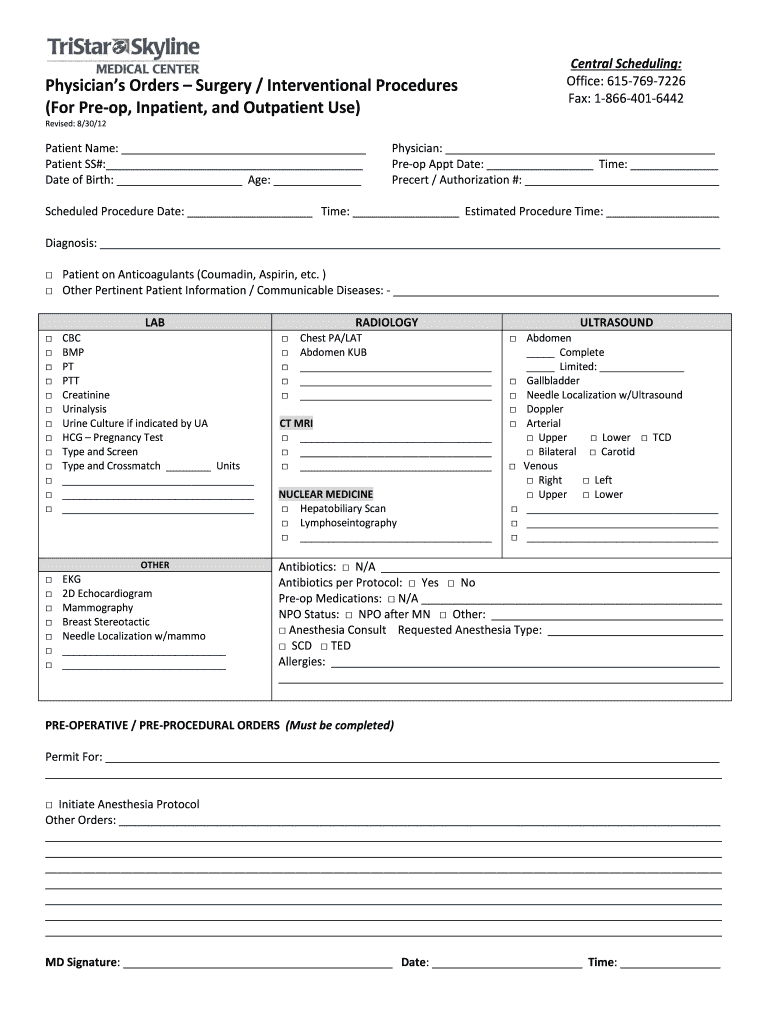 Physician Orders Surgery / Interventional Procedures (For Prop, Inpatient, and Outpatient Use)Central Scheduling: Office: 6157697226 Fax: 18664016442Revised: 8/30/12Patient Name: Patient SS#: Date