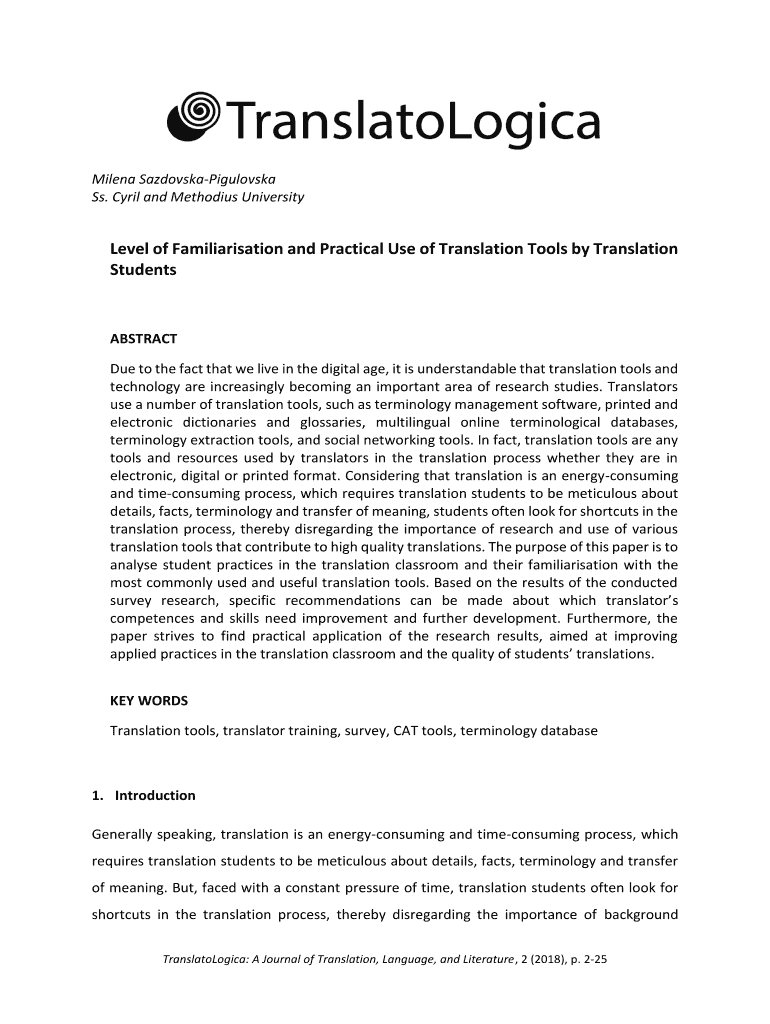 SS. Cyril and Methods UniversityLevel of Familiarization and Practical Use of Translation Tools by Translation