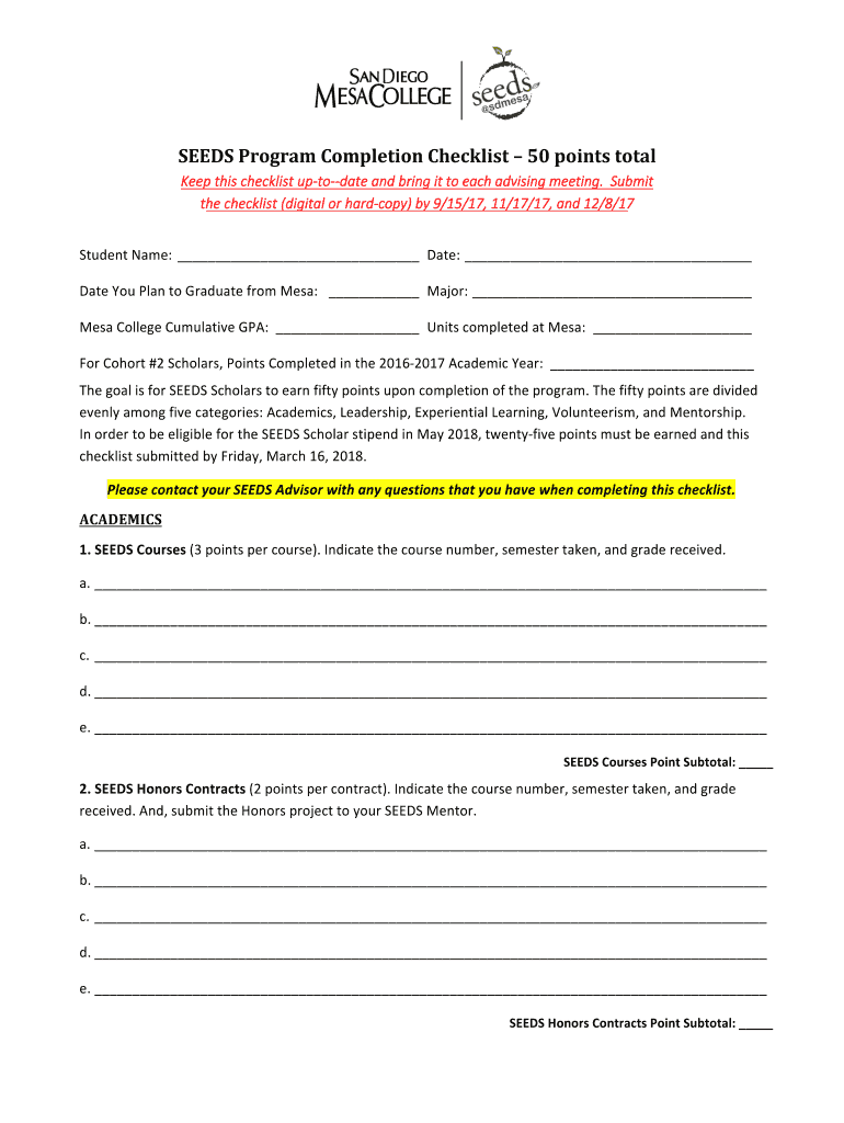 SEEDSProgramCompletionChecklist50pointstotal Keep this checklist update and bring it to each advising meeting. Submit the checklist (digital or hard copy) by 9/15/17, 11/17/17, and 12/8/17 StudentName: