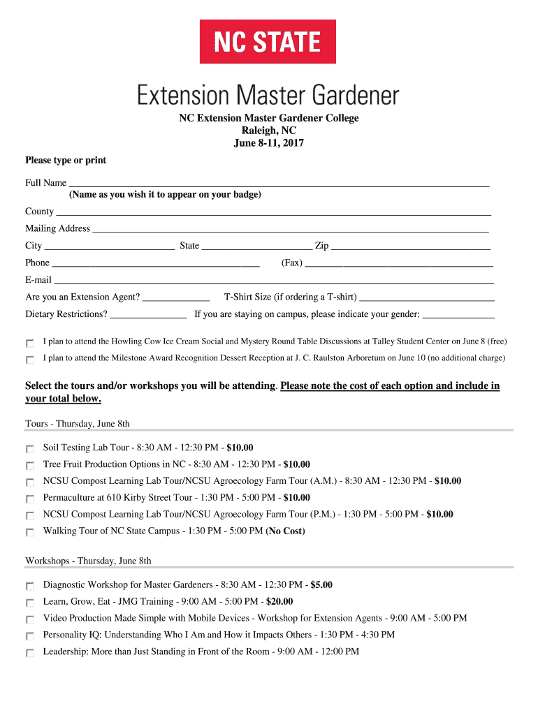 NC Extension Master Gardener College Raleigh, NC June 811, 2017 Please type or print Full Name (Name as you wish it to appear on your badge) County Mailing Address City State Zip Phone (Fax) Email