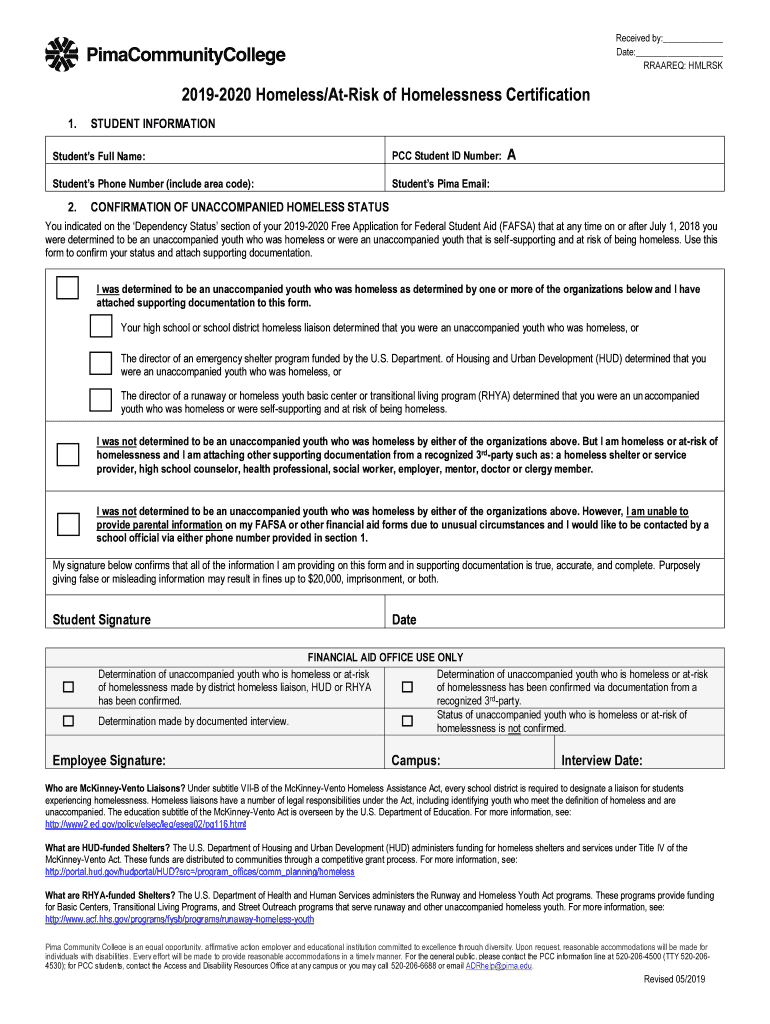 Received by: Date: RARE: HMLRSK20192020 Homeless/Risk of Homelessness Certification 1.STUDENT INFORMATIONStudents Full Name:PCC Student ID Number:Students Phone Number (include area code):Students
