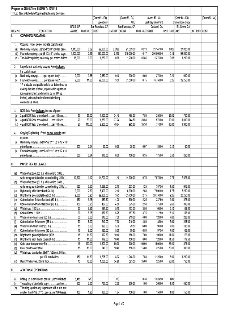 Program No 2980S Term 11/01/14 To 10/31/15 TITLE: QuickSchedule Copying/Duplicating ServicesITEM NO DESCRIPTION I. COPYING/DUPLICATING: 1. (a) (b) (c)Copying: Prices do not include cost of paper.