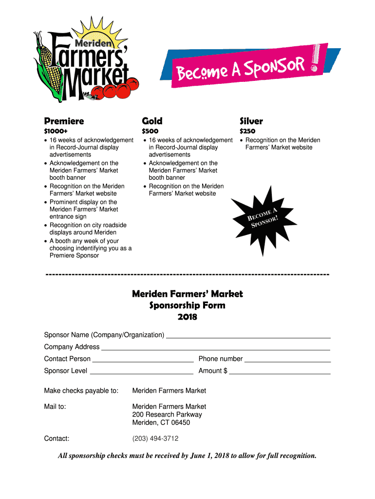 PremiereGoldSilver×1000+$500×250 16 weeks of acknowledgement in RecordJournal display advertisements Acknowledgement on the Meriden Farmers Market booth banner Recognition on the Meriden Farmers