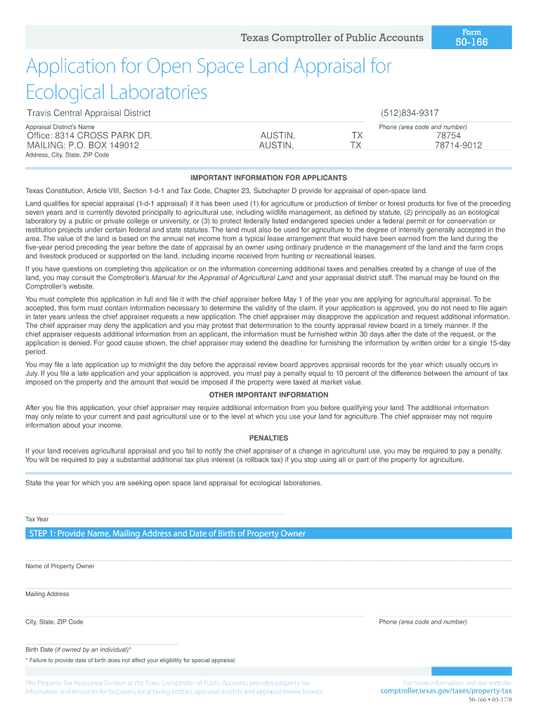 Texas Comptroller of Public AccountsForm50166Application for Open Space Land Appraisal for Ecological Laboratories Travis Central Appraisal District (512)8349317 Appraisal Districts Telephone (area