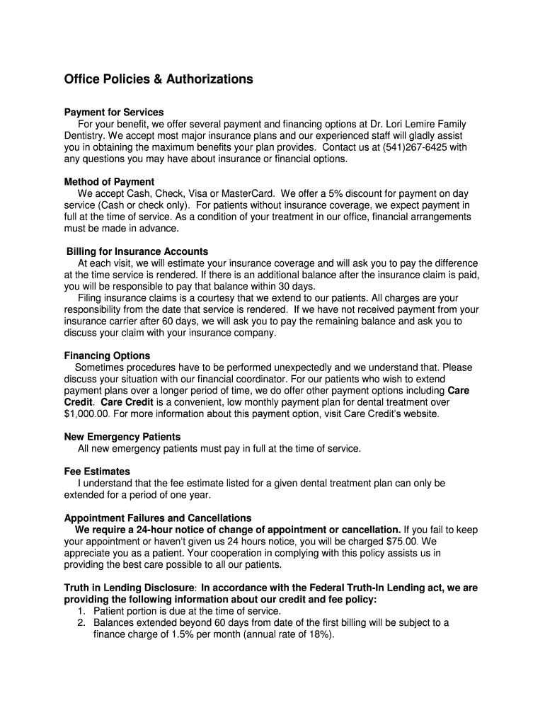 Office Policies & Authorizations Payment for Services For your benefit, we offer several payment and financing options at Dr. Lori Bemire Family Dentistry. We accept most major insurance plans and