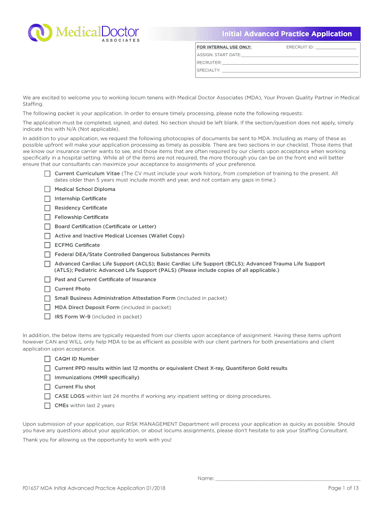 Initial Advanced Practice Application FOR INTERNAL USE ONLY:RECRUIT ID: ASSIGN. START DATE: RECRUITER: SPECIALTY: We are excited to welcome you to working locum tenens with Medical Doctor Associates