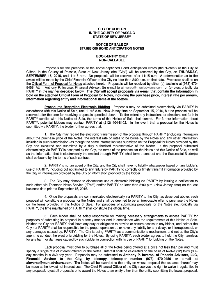 CITY OF CLIFTON IN THE COUNTY OF PASSAIC STATE OF NEW JERSEY NOTICE OF SALE OF $17,983,000 BOND ANTICIPATION NOTES COVENTRY ONLY CALLABLE Proposals for the purchase of the above captioned Bond Anticipation