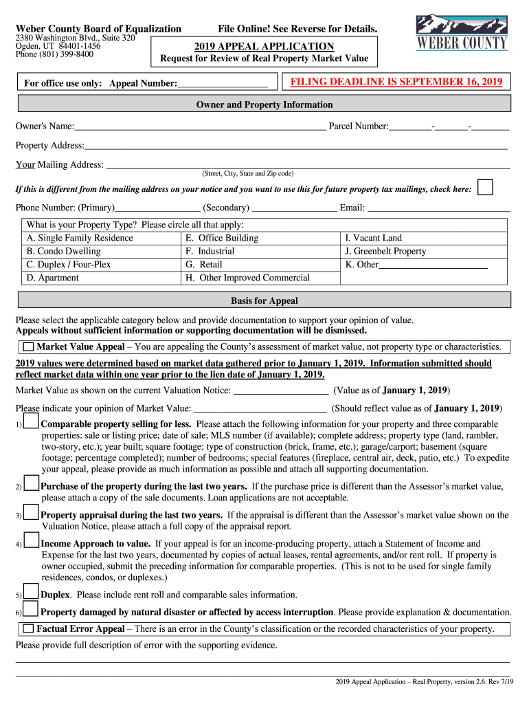 Weber County Board of Equalization 2380 Washington Blvd., Suite 320 Ogden, UT 844011456 Phone (801) 3998400File Online! See Reverse for Details. 2019 APPEAL APPLICATIONRequest for Review of Real Property