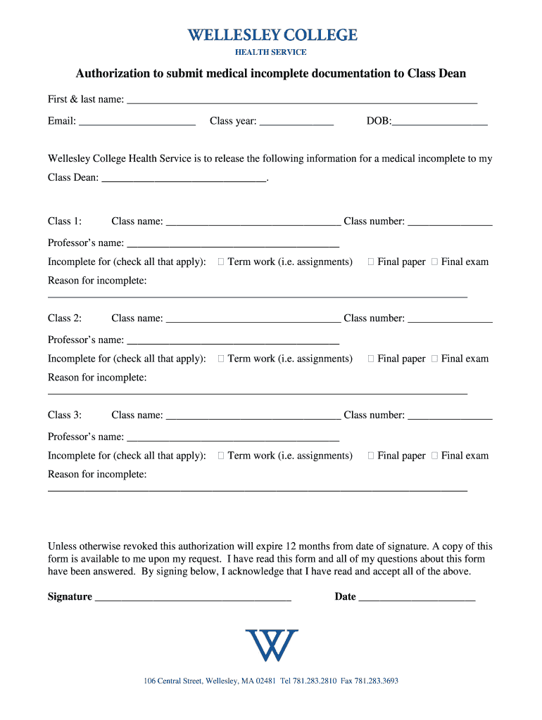 HEALTH SERVICEAuthorization to submit medical incomplete documentation to Class Dean First & last name: Email: Class year: DOB: Wellesley College Health Service is to release the following information