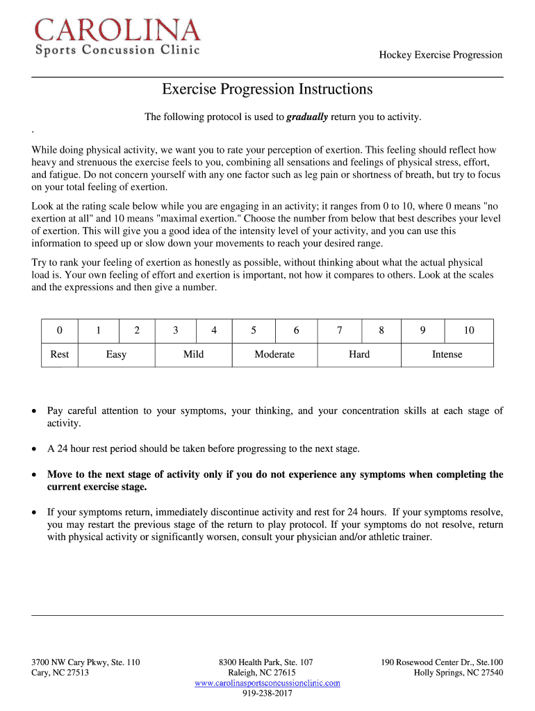 Hockey Exercise Progression Instructions The following protocol is used to gradually return you to activity. . While doing physical activity, we want you to rate your perception of exertion. This
