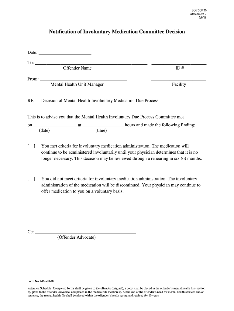 SOP 508.26 Attachment 7 5/9/18Notification of Involuntary Medication Committee DecisionDate: To: Offender Name ID # From: Mental Health Unit Manager RE: FacilityDecision of Mental Health Involuntary