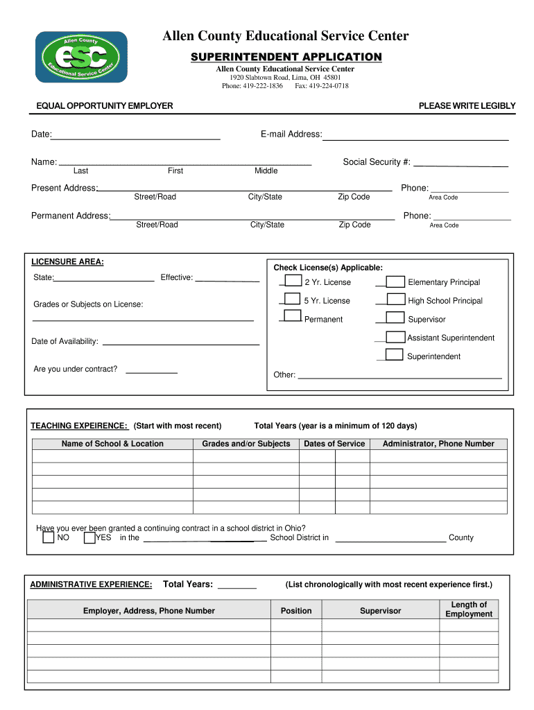 Allen County Educational Service Center SUPERINTENDENT APPLICATION Allen County Educational Service Center 1920 Slab town Road, Lima, OH 45801 Phone: 4192221836 Fax: 4192240718EQUAL OPPORTUNITY EMPLOYERPLEASE