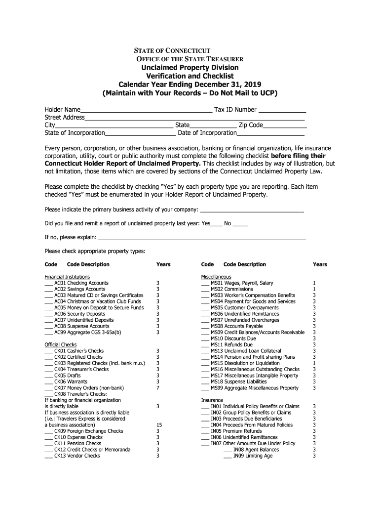 STATE OF CONNECTICUT OFFICE OF THE STATE TREASURER Unclaimed Property Division Verification and Checklist Calendar Year Ending December 31, 2019 (Maintain with Your Records Do Not Mail to UCP) Holder
