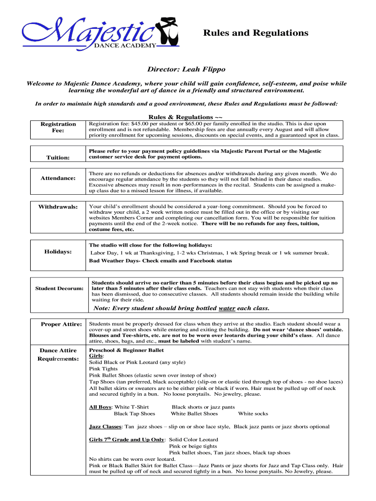 Rules and RegulationsDirector: Leah Flippy Welcome to Majestic Dance Academy, where your child will gain confidence, self-esteem, and poise while learning the wonderful art of dance in a friendly