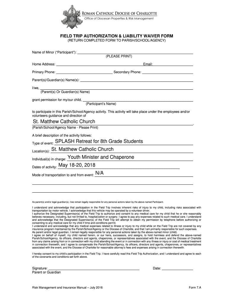 FIELD TRIP AUTHORIZATION & LIABILITY WAIVER FORM (RETURN COMPLETED FORM TO PARISH/SCHOOL/AGENCY)Name of Minor (Participant): (PLEASE PRINT) Home Address:Email:Primary Phone:Secondary Phone:Parent(s)/Guardian(s)