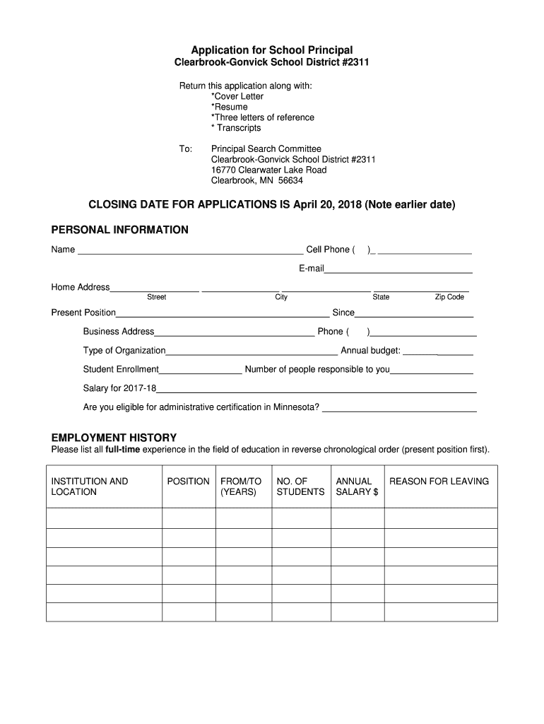 Application for School Principal ClearbrookGonvick School District #2311 Return this application along with: *Cover Letter *Resume *Three letters of reference * Transcripts To:Principal Search Committee