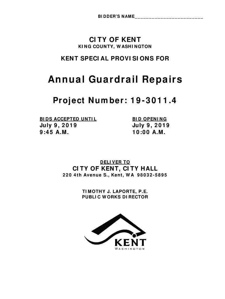 BIDDERS NAME CITY OF KENT KING COUNTY, WASHINGTONIAN SPECIAL PROVISIONS Annual Guardrail Repairs Project Number: 193011.4 BIDS ACCEPTED UNTIL BID OPENING July 9, 2019 9:45 A.M. July 9, 2019 10:00
