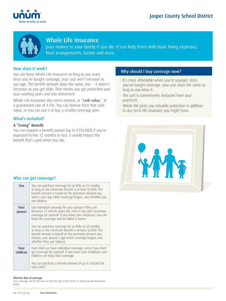 Jasper County School DistrictWhole Life Insurance pays money to your family if you die. It can help them with basic living expenses, final arrangements, tuition and more. How does it work? You can