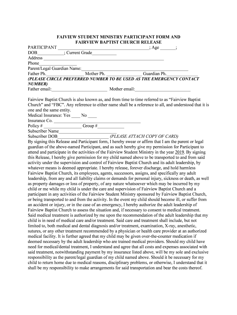 FAIRVIEW STUDENT MINISTRY PARTICIPANT FORM AND FAIRVIEW BAPTIST CHURCH RELEASE PARTICIPANT ; Age ; DOB ; Current Grade Address Phone Parent/Legal Guardian Name: Father pH. Mother pH. Guardian pH.