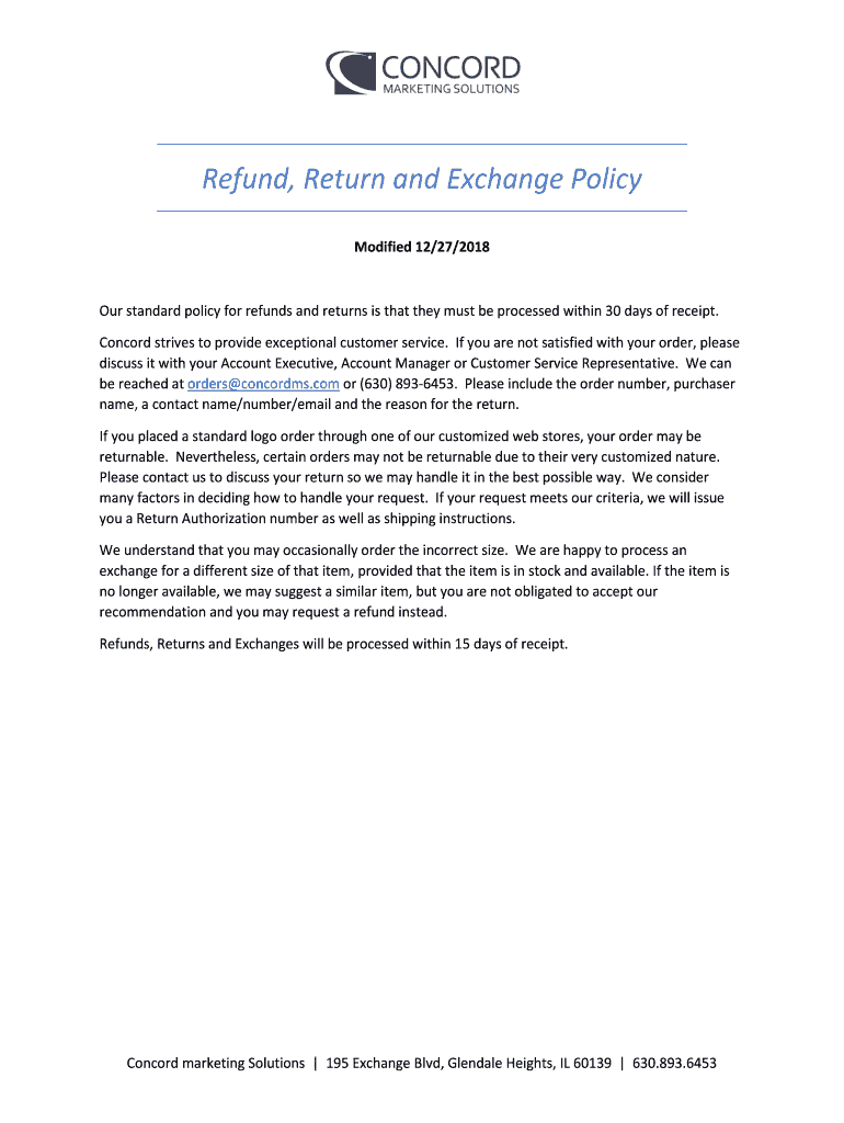 Modified 12/27/2018Our standard policy for refunds and returns is that they must be processed within 30 days of receipt.