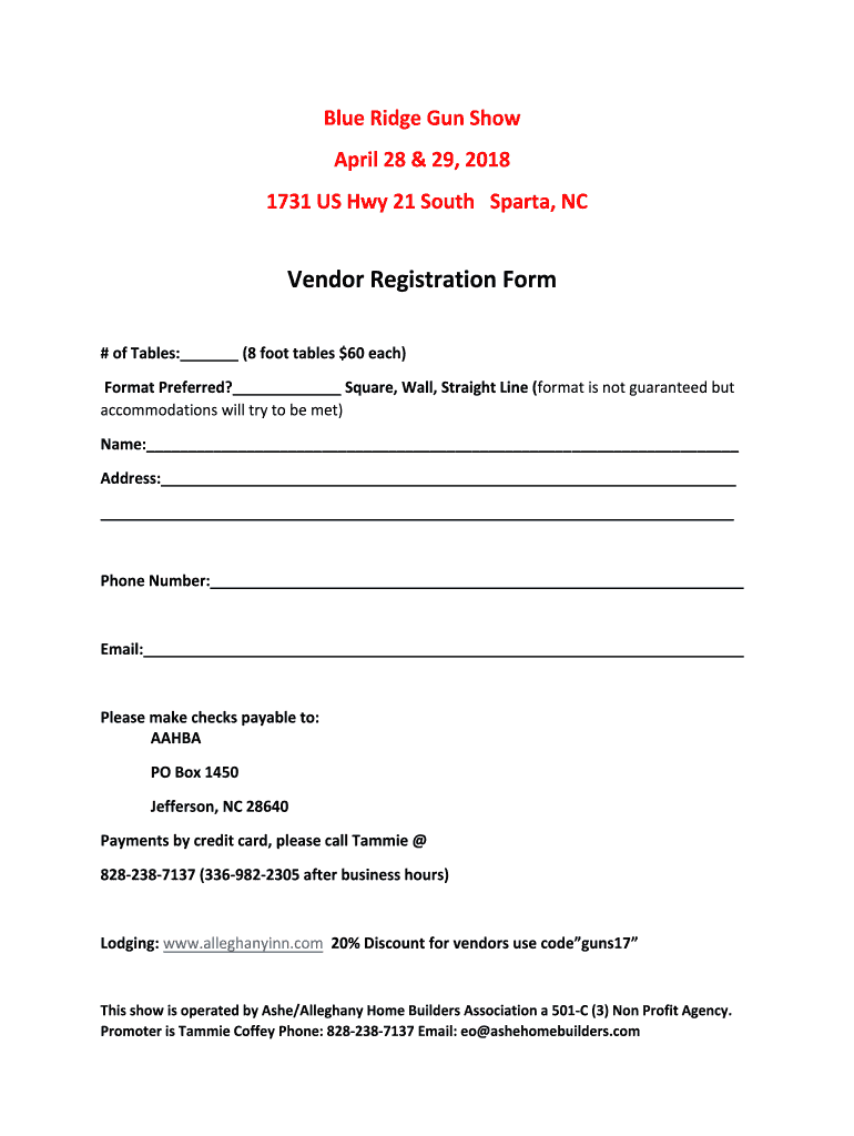 Blue Ridge Gun Show April 28 & 29, 2018 1731 US Hwy 21 South Sparta, Vendor Registration Form # of Tables: (8 foot tables $60 each) Format Preferred? Square, Wall, Straight Line (format is not guaranteed,