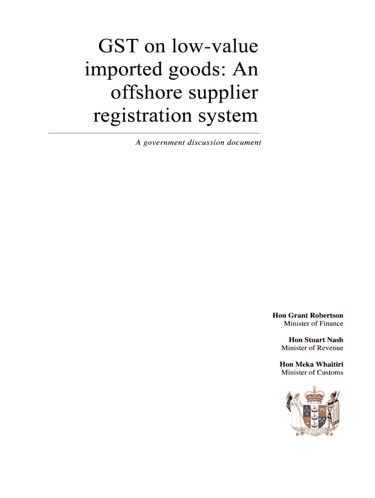 GST on low value imported goods: An offshore supplier registration system A government discussion document Hon Grant Robertson Minister of Finance Hon Stuart Nash Minister of Revenue Hon Mesa Waiting