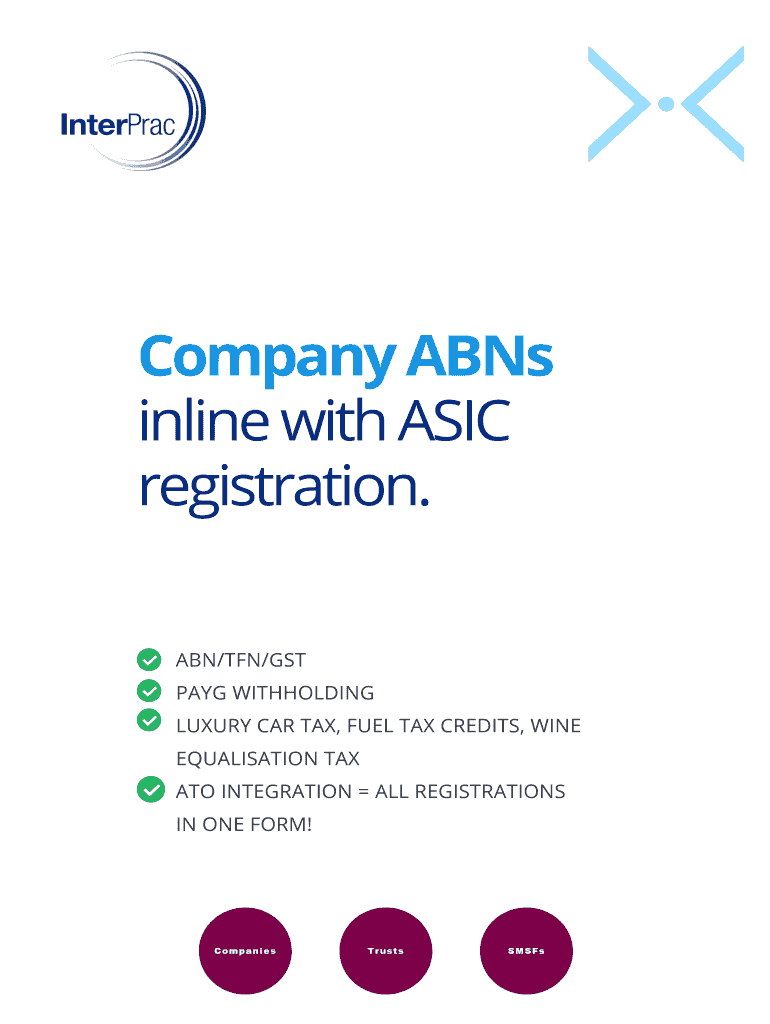 Company ABCs inline with ASIC registration. ABN/TEN/GST PAY WITHHOLDING LUXURY CAR TAX, FUEL TAX CREDITS, WINE Equalization TAX ATO INTEGRATION ALL REGISTRATIONS IN ONE FORM!ABN Registrations inline