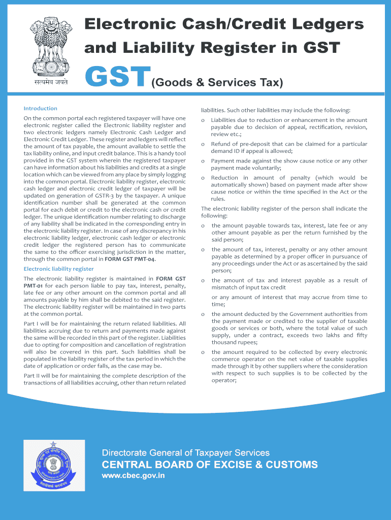 Electronic Cash/Credit Ledgers and Liability Register in GST(Goods & Services Tax)Introduction liabilities. Such other liabilities may include the following:On the common portal each registered taxpayer