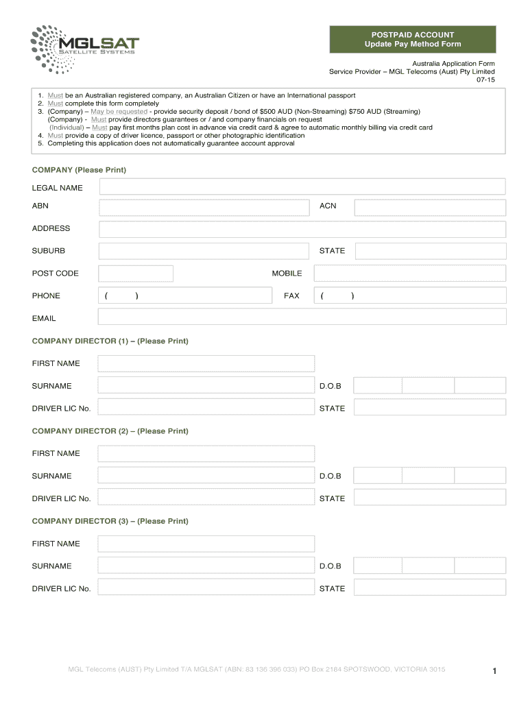 POSTPAID ACCOUNT Update Pay Method Form Australia Application Form Service Provider MEL Telecoms (Must) Pty Limited 0715 1. Must be an Australian registered company, an Australian Citizen or have